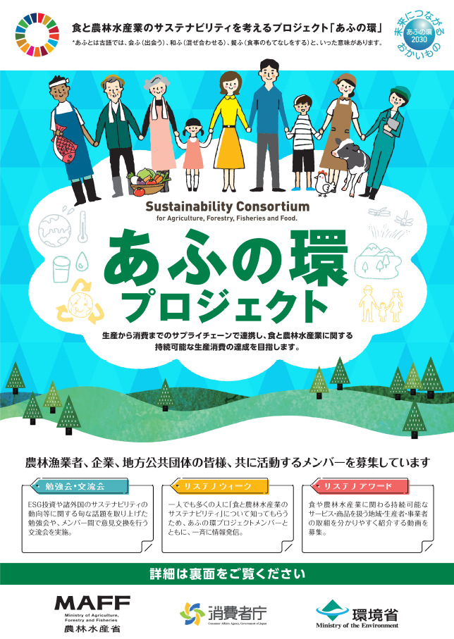 「あふの環 2030 プロジェクト~食と農林水産業のサステナビリティを考える~」は、国連の持続可能な開発目標(SDGs)の 2030 年までの達成を目指し、持続可能な生産消費を広めるための活動を推進するプロジェクトです(農林水産省、消費者庁、環境省連携)。7月末現在、201 社・団体等が参画しています。