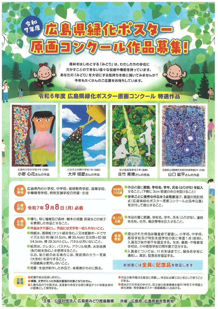 広島県緑化ポスター原画コンクールは、次代を担う児童・生徒たちが、森林の持つ役割や緑を守り育てることの意義や必要性を学び、考えるきっかけとなるよう、公益社団法人広島県みどり推進機構の主催により、昭和28年から開催されています。