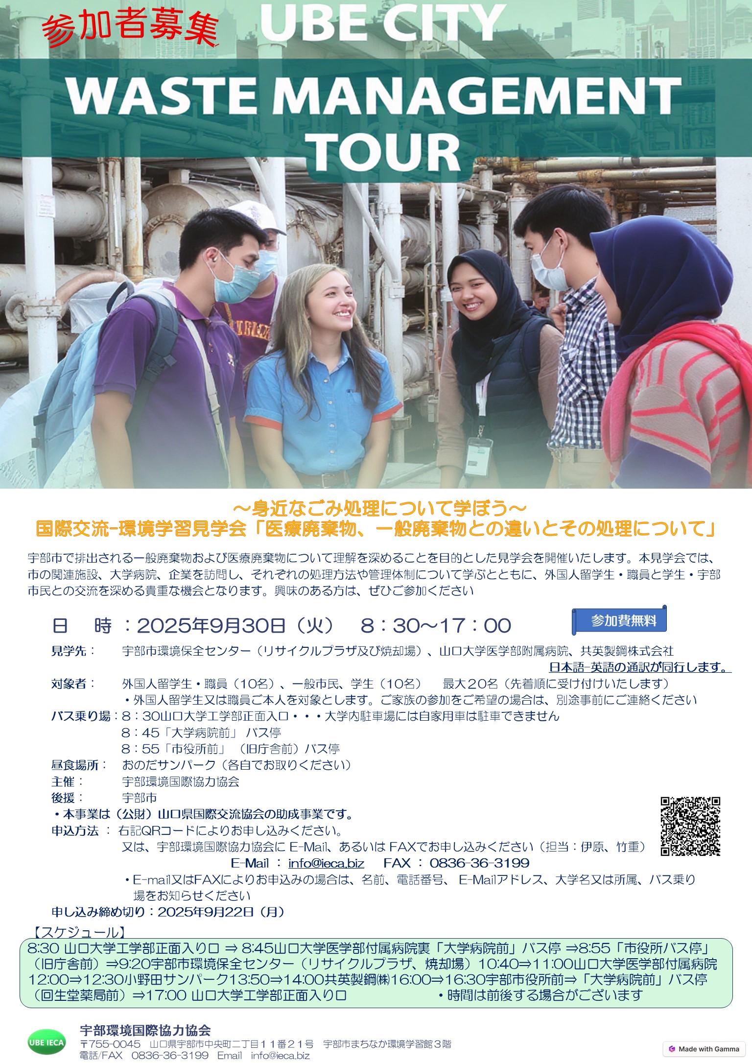 このたび、2025年度環境保全技術講座として、留学生から要望のあった、宇部市で排出される医療廃棄物および一般廃棄物について理解を深めることを目的とした見学会を開催いたします。本見学会では、市の関連施設、大学病院、企業を訪問し、それぞれの処理方法や管理体制について実際の現場で学ぶとともに、外国人留学生・職員と学生・宇部市民との交流を深める貴重な機会となります。