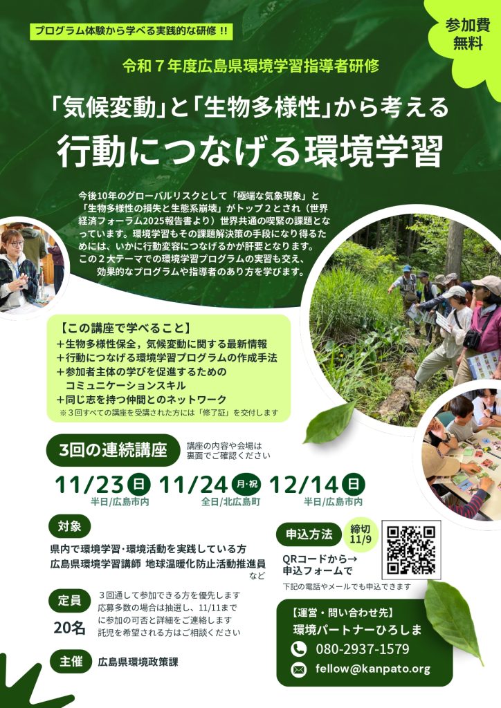 広島県内で環境学習や環境活動を実践・推進している方を対象に、環境に関する最新情報や効果的な指導手法等の習得を目的とした研修です。