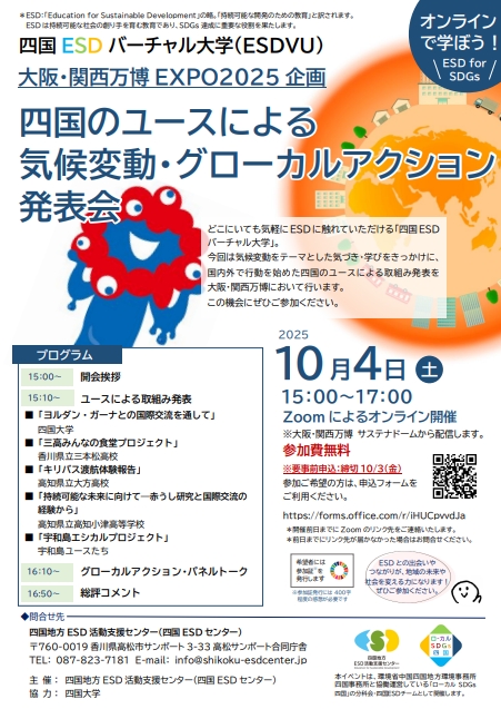 今回は気候変動をテーマとした気づき・学びをきっかけに、国内外で行動を始めた四国のユースによる取組み発表を大阪・関西万博において行います。この機会にぜひご参加ください。
