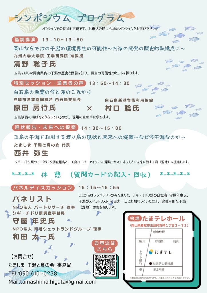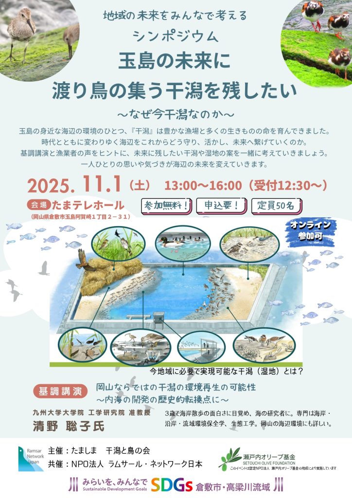 玉島の身近な海辺の環境のひとつ、『干潟』は豊かな漁場と多くの生きものの命を育んできました。時代とともに変わりゆく海辺をこれからどう守り、活かし、未来へ繋げていくのか。基調講演と漁業者の声をヒントに、未来に残したい干潟や湿地の案を一緒に考えていきましょう。一人ひとりの思いや気づきが地域の海辺の未来を変えていきます。