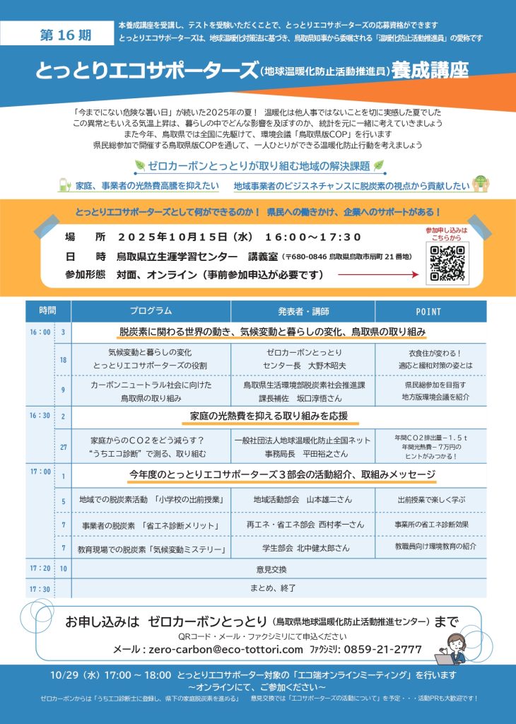 *「とっとりエコサポーターズ」とは「鳥取県地球温暖化防止活動推進員」の愛称です。身近な地球温暖化防止活動をリードする役割を担っていただくように鳥取県がとっとりエコサポーターズに委嘱します。