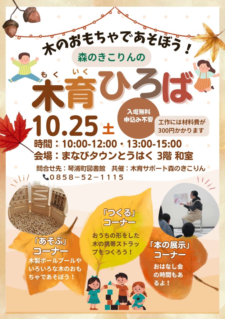 「木とふれあい、木に学び、木と生きる」取り組みである木育の活動をサポートしている木育サポート森のきこりんとの共催で、木製ボールプールや木のおもちゃで遊んだり、工作をしたりするイベントを実施します。