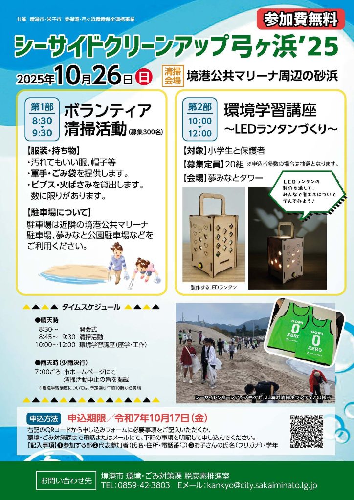 境港市、米子市にとって大切な地域資源である美保湾・弓ヶ浜の環境改善を図るため、米子市と共催で令和7年(2025年)10月26日(日)に「シーサイドクリーンアップ’25」を開催します。
