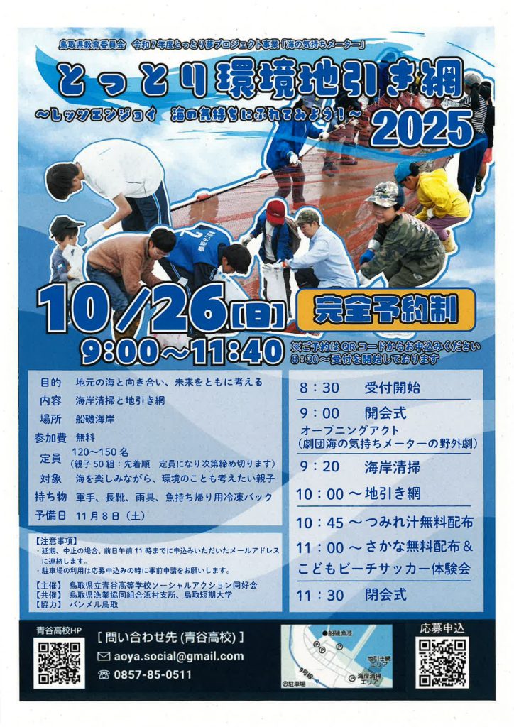 ごみを拾い、きれいにした海岸で地引き網を行うことで地域の子どもたちと環境保全の大切さと海の楽しさを共有します。劇団海の気持ちメーターの野外劇、鳥取短期大学生活学科フードデザイン専攻の学生による「つみれ汁」の提供、バンメル鳥取による「こどもビーチサッカー体験会」もあります。