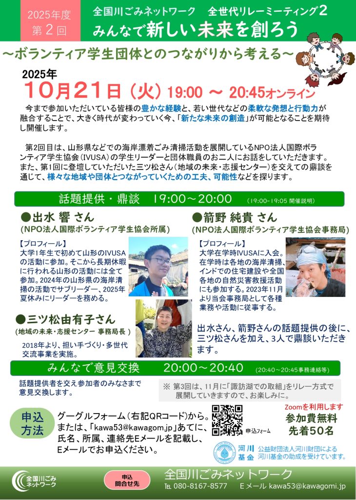 今回は、山形県などでの海岸漂着ごみ清掃活動を展開しているNPO法人国際ボランティア学生協会(IVUSA)の学生リーダーと団体職員のお二人をお招きします。また、第1回に登壇していただいた三ツ松さん(地域の未来・志援センター)を交えての鼎談を通じて、様々な地域や団体とつながっていくための工夫、可能性などを探ります。もちろん、第1回の参加有無に関わらずご参加ください。