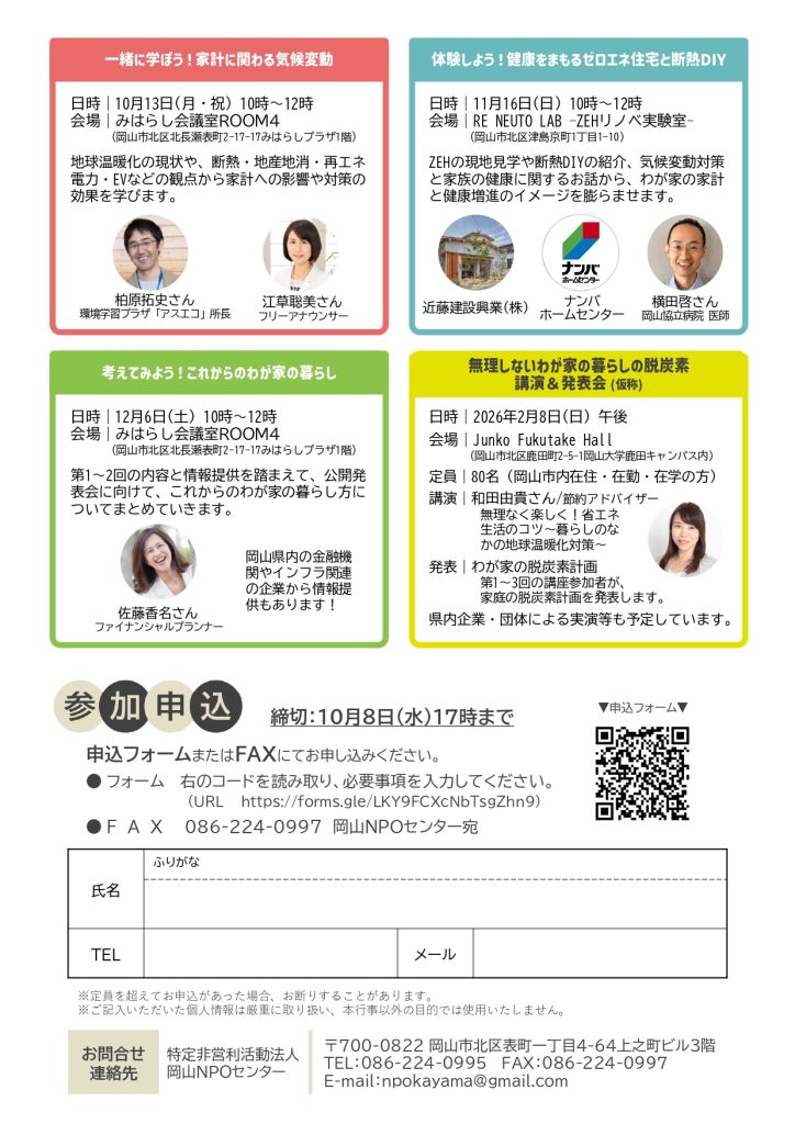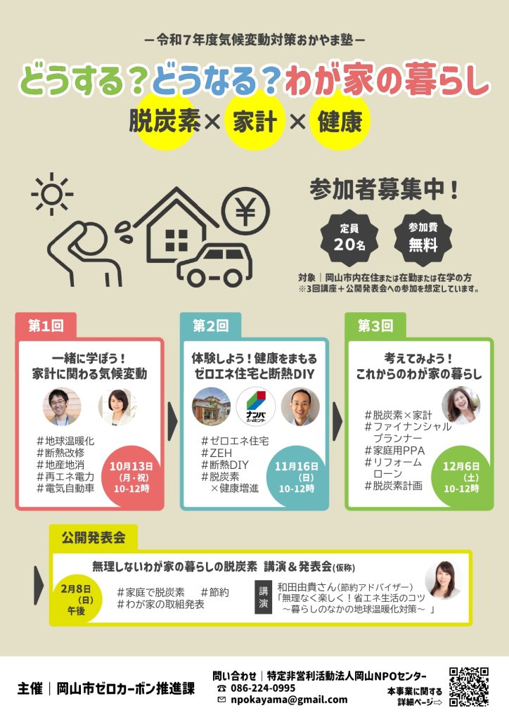 今回の気候変動対策おかやま塾は、ファミリー層をメインターゲットに、「わが家の暮らしの脱炭素」を考えます。3回連続講座に加えて、2月の公開発表会でご家庭の脱炭素計画をシェアしていただきます。