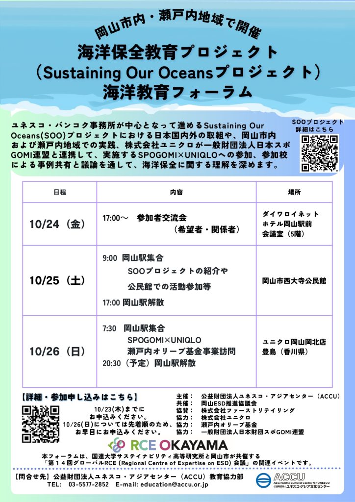 ユネスコ・アジア文化センターは海洋保全教育プロジェクト(Sustaining Our Oceansプロジェクト※)の一環として、岡山市内および瀬戸内地域にて「海洋教育フォーラム」を開催します。