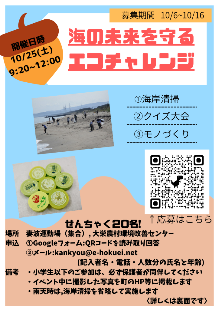 チラシの二次元コードから、またはメール(kankyou@e-hokuei.net)に必要事項(代表者氏名、電話番号、参加人数、氏名、年齢)を記入いただき、ご応募ください。