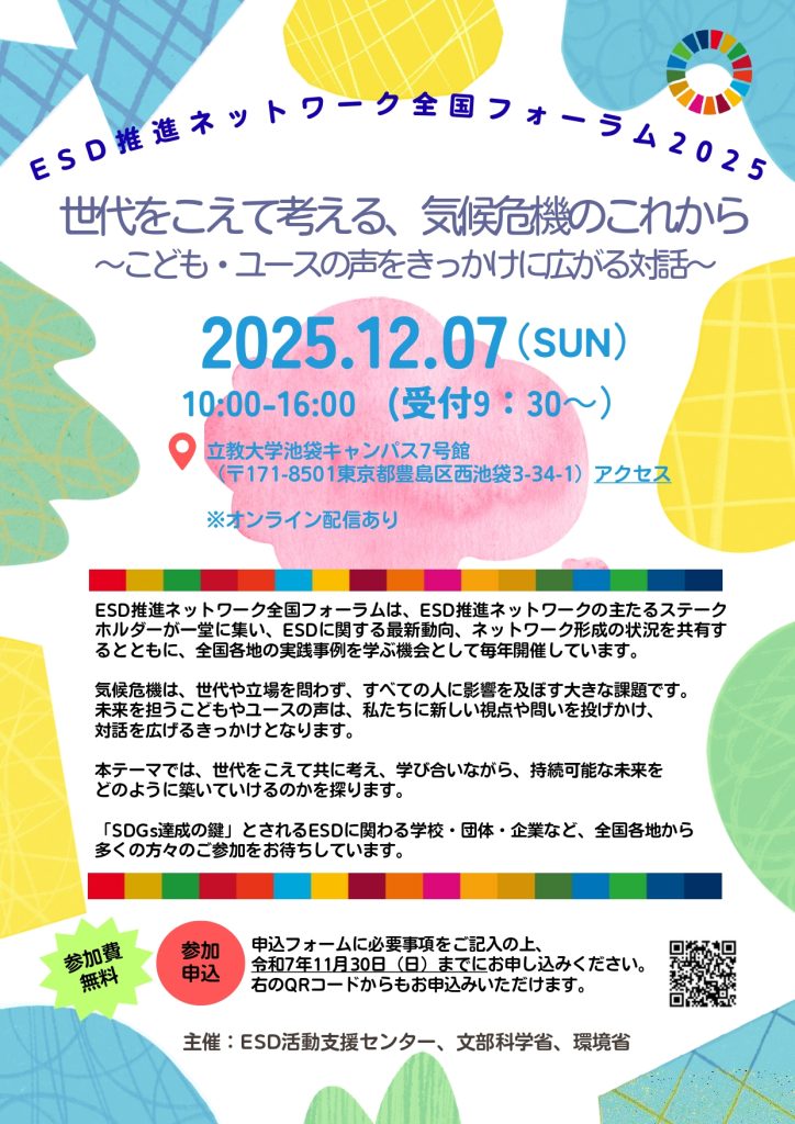 「SDGs 達成の鍵」とされている ESD に関わる学校・ 団体・企業等、全国各地から多くの方々のご参加をお待ちしています。