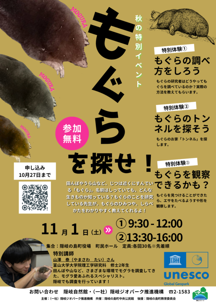 もぐらのことを研究している先生が、もぐらのひみつや、調べ方をわかりやすく教えてくれます。運がよかったら生きたもぐらを観察できるかも!