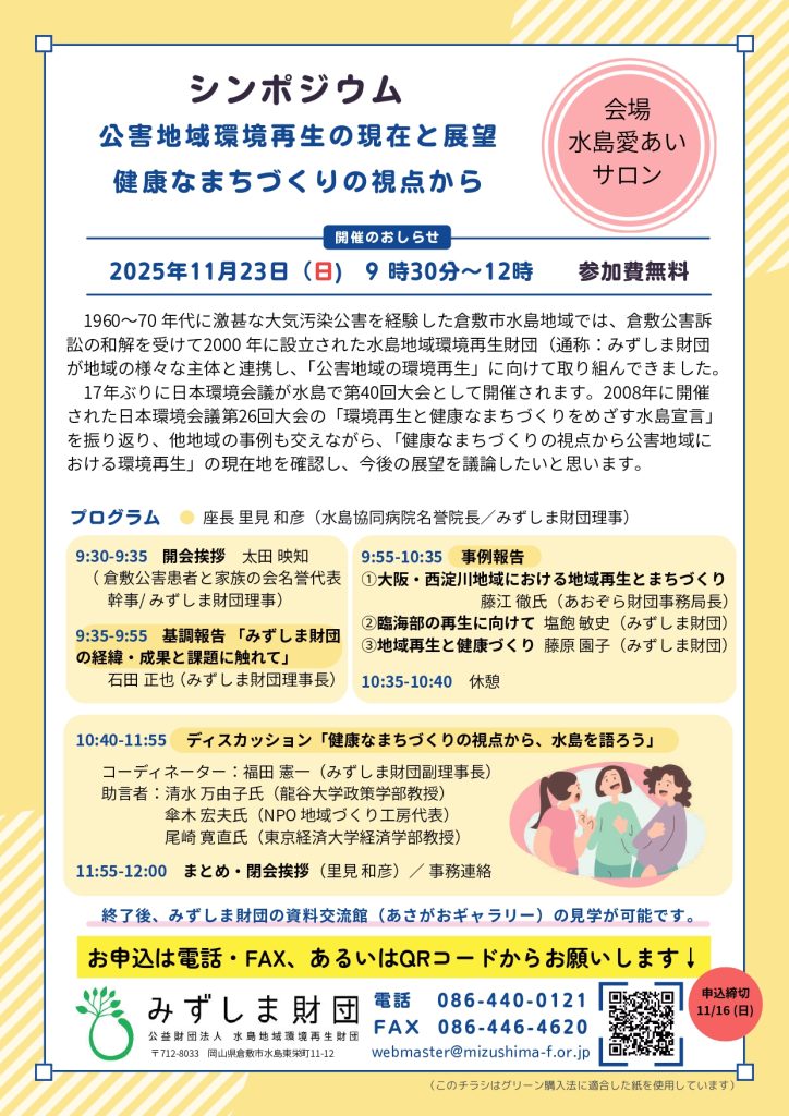 2008年に水島で開催された日本環境会議 第26回大会の「環境再生と健康なまちづくりをめざす水島宣言」を振り返り、他の地域の事例も交えながら、「健康なまちづくりの視点から公害地域における環境再生」の現在地を確認し、みなさんと一緒に、今後の展望を議論したいと思います。