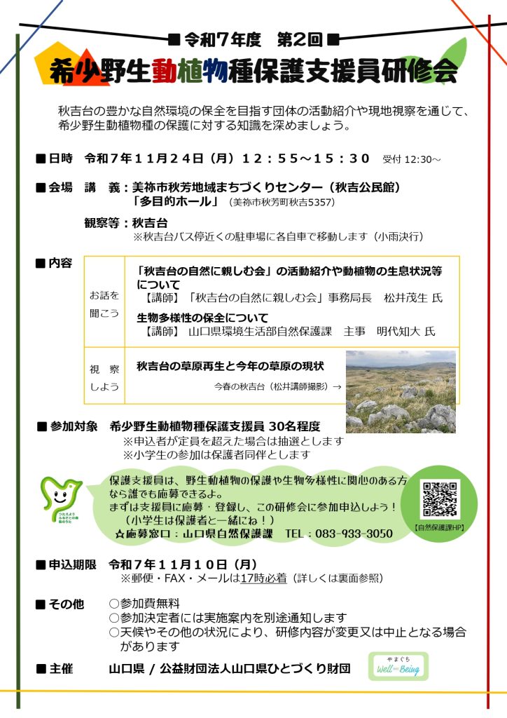 秋吉台の豊かな自然環境の保全を目指す団体の活動紹介や現地視察を通じて、希少野生動植物種の保護に対する知識を深めましょう。