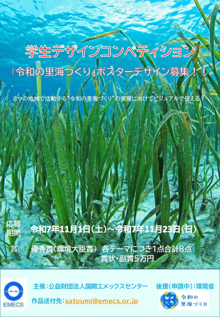 公益財団法人国際エメックスセンター(以下、「エメックスセンター」という。)は、全国の大学・短期大学など高等教育機関に在籍する学生を対象に、「令和の里海づくりポスターデザインコンペティション」を実施します。