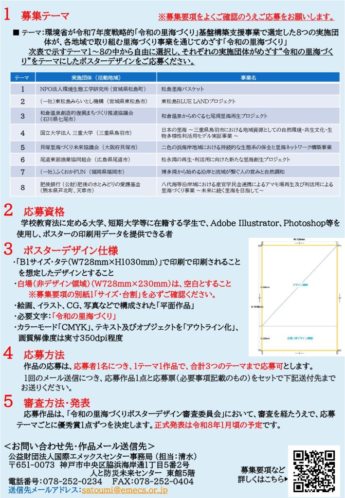 本コンペティションは、環境省が令和7年度戦略的「令和の里海づくり」基盤構築支援事業で選定した8つの実施団体が、各地域で取り組む里海づくり事業を通してめざす「令和の里海づくり」をテーマにしたポスターデザインを募集するものです。