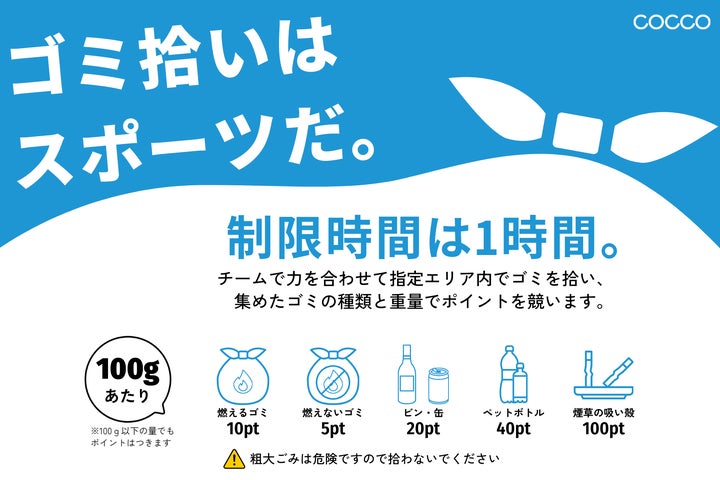 制限時間1時間の間に指定エリア内でチームごとにゴミを拾い、その種類と重量に応じてポイントを競います。詳細は当日配布のルールブックをご確認ください。