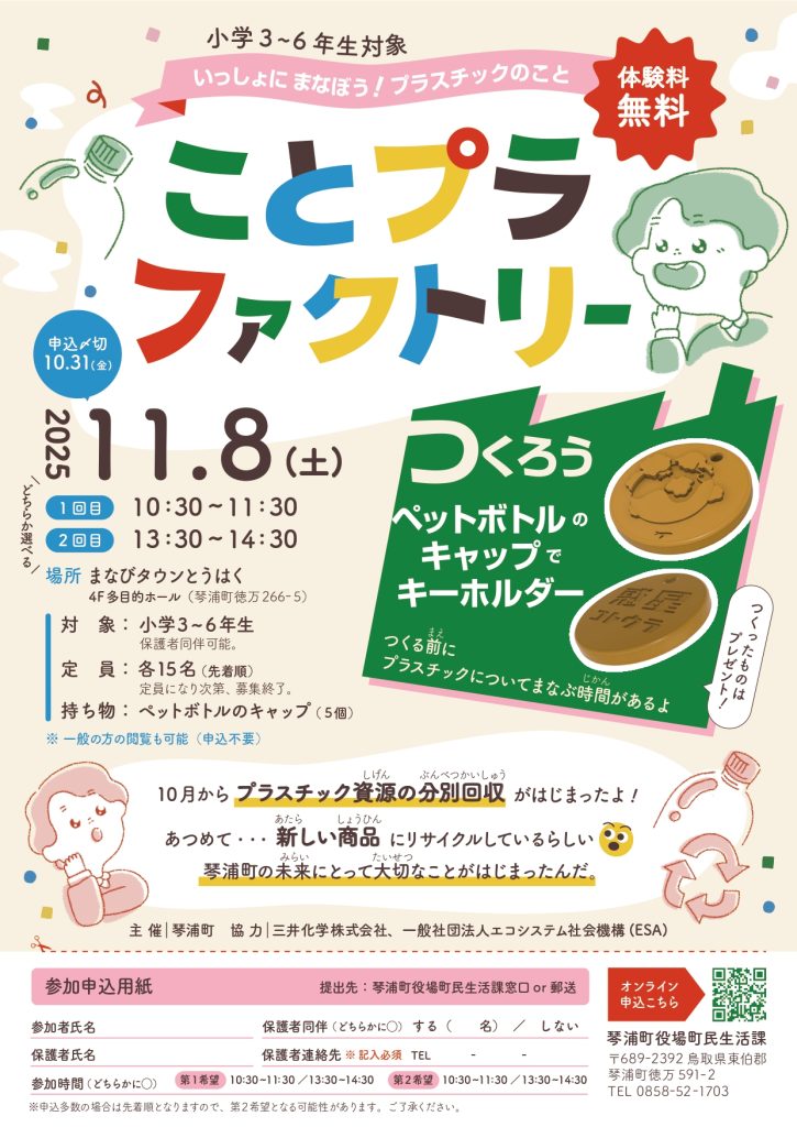琴浦町では、令和7年10月から始まったプラスチック分別回収にあわせ、こどもたちが環境について楽しく学べる体験型イベント「ことプラファクトリー」を開催します。