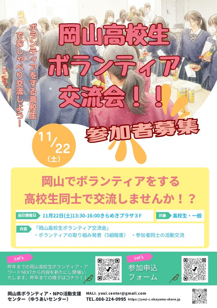県内高校生のみなさまの活動を応援する機会として「岡山高校生ボランティア交流会」を開催します!