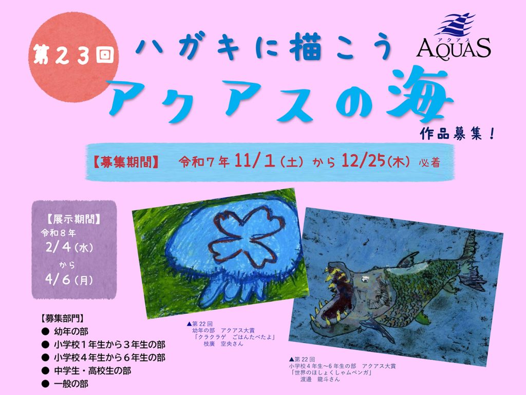 ハガキサイズのキャンバスにアクアスで展示している生物や、アクアスの外観、身近な海の風景、海や川の生物、想像上の魚などを描いて応募してください。参加賞として全員に、展示期間有効な無料招待券をプレゼントいたします。