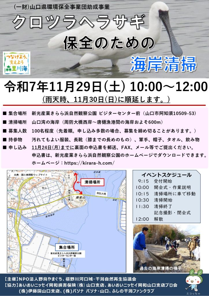 海岸清掃を通じて、絶滅危惧種であるクロツラヘラサギ等の生息場所をきれいにし、豊かな干潟環境を目指します。ぜひ、ご協力をお願いします。