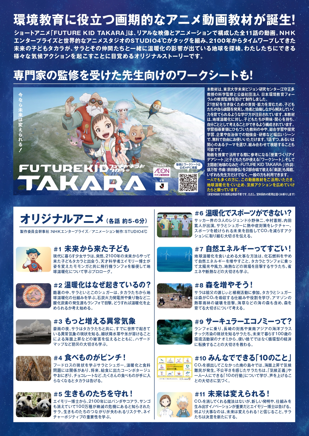 舞台は未来の地球。2100年から来た少年タカラと現代の少女サラが、気候変動で変わる世界を旅しながら「未来を守るヒント」を探していきます。科学知識を伝えるだけでなく、物語を通して感情に届き、気候問題を“自分の未来”として感じられる教材です。