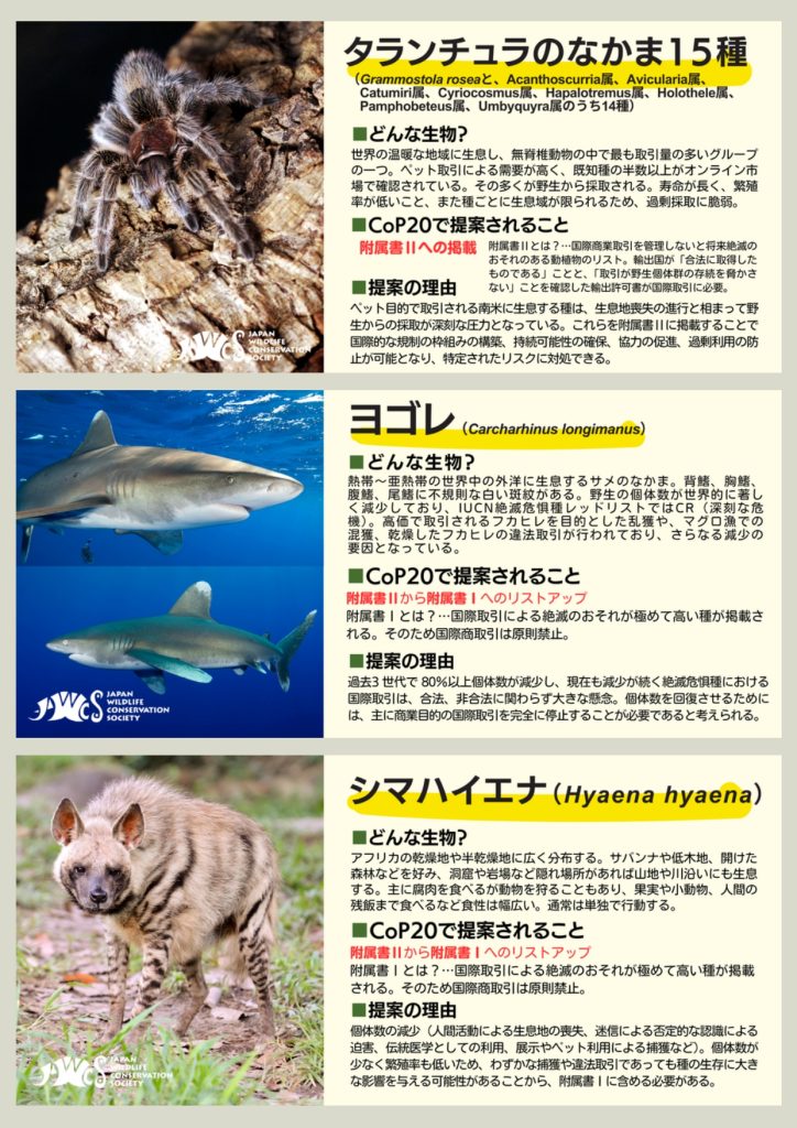 CoP20で注目されている動物種をいくつかピックアップし、なぜ議題になっているのか、どんな提案があるのかをわかりやすくご紹介しています。ぜひご覧ください。