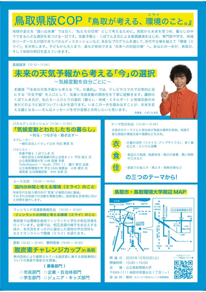 「気付き」にとどまらず「今からできる行動」の実践に繋がる場を目指し、誰でも気軽に参加できる鳥取県版のCOPを開催。楽しみながら脱炭素を学び、あなたの行動もきっと少しだけ変わる、そんなイベントです。