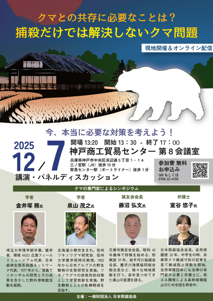 共存の危機にある「クマと人」の関係を修復するために、今何が起こっているか、すぐに必要な対策は何か、クマ生息地やクマ出没の最前線に詳しい専門家の方々をお招きしました。一緒に考えましょう!