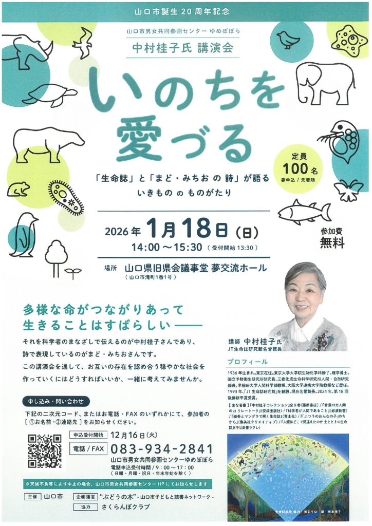 いのちの多様性について、研究者の視点から、山口県出身の作家 まど・みちおさんの詩とともにお話しいただきます。