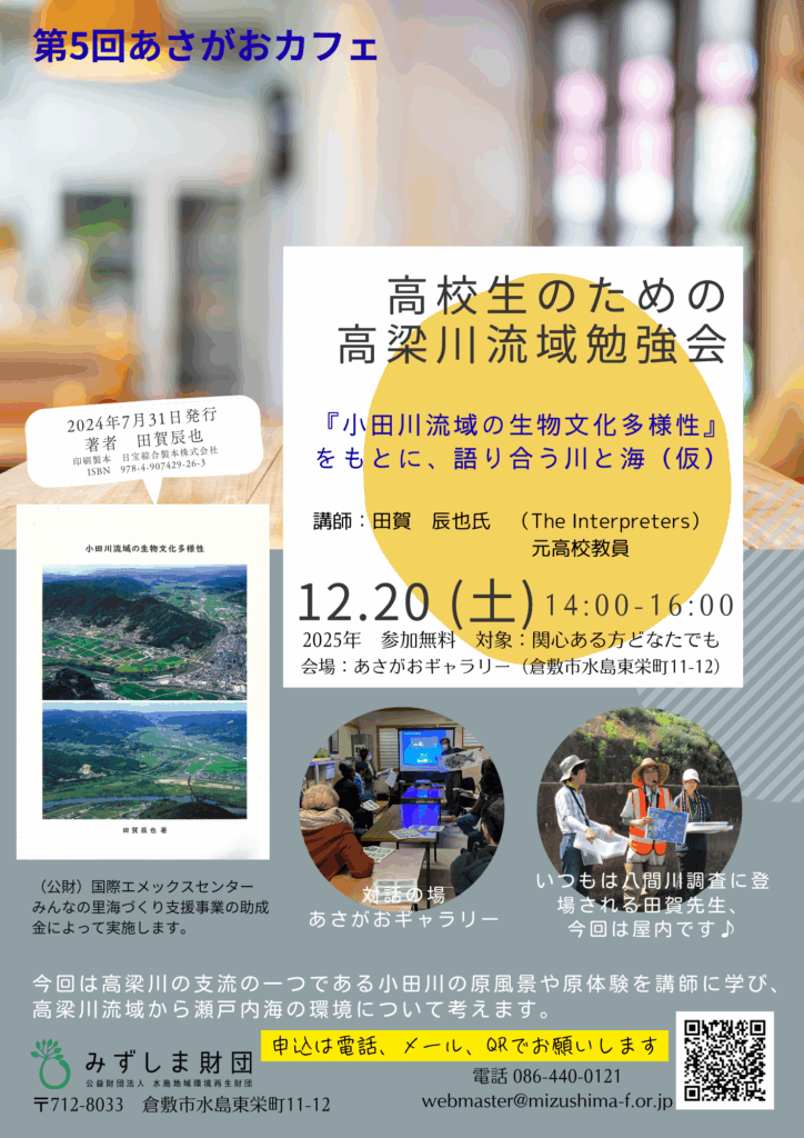みずしま財団恒例の八間川調査隊でもおなじみの、田賀辰也先生(The Interpreters、元高校教員)を講師に迎えて、高梁川の支流である小田川(おだがわ)の原風景や原体験について学び、高梁川流域から瀬戸内海の環境について考えます。