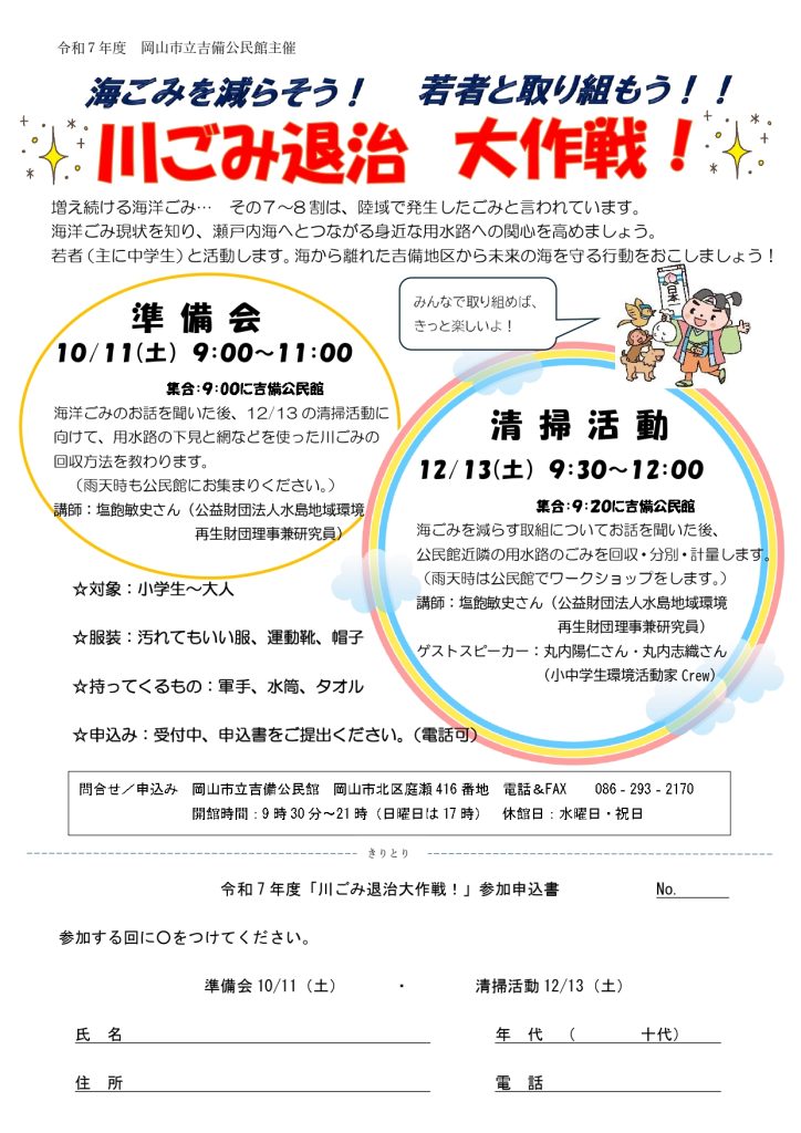 若者(主に中学生)と活動します。海から離れた吉備地区から未来の海を守る行動をおこしましょう。海ごみを減らす取組についてお話を聞いた後、公民館近隣の用水路のごみを回収・分別・計量します。(雨天時は公民館でワークショップをします。)