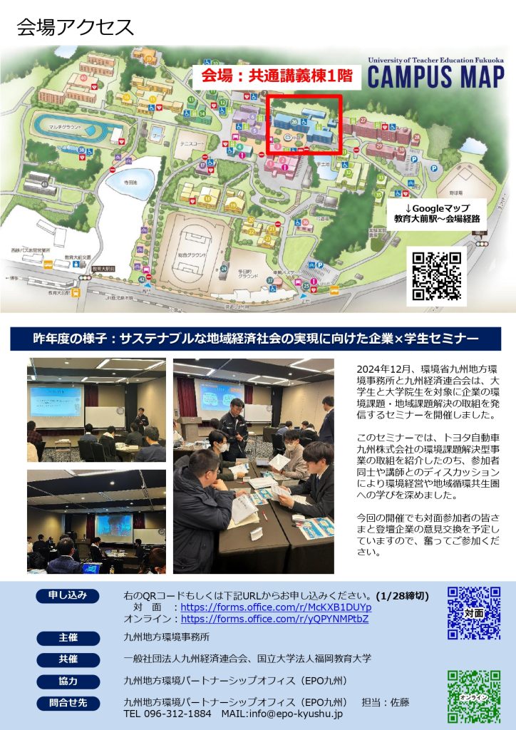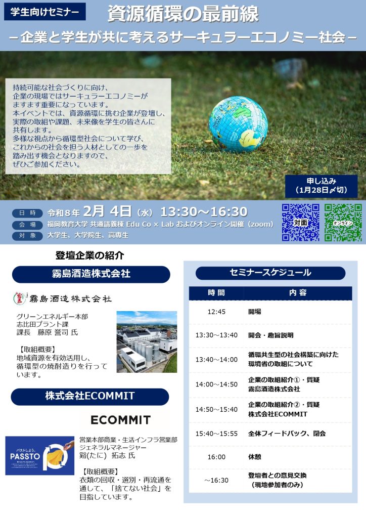 九州地方環境事務所・九州経済連合会・福岡教育大学の3者は協働で、学生を対象としたサーキュラーエコノミー社会に関するセミナーを開催します。