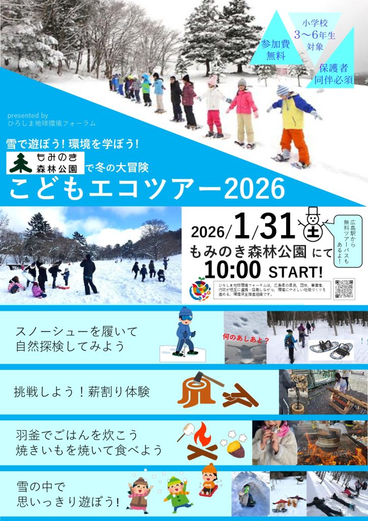 雪山探検は、西中国山地の豊かな自然と雪山に息づく動植物を観察します。森の働きを通じて自然のシステムである、山から海へ流れる水の大循環などの知識を深めます。薪割り、間伐材を使ってごはん炊きや焼きいも作りを体験します。