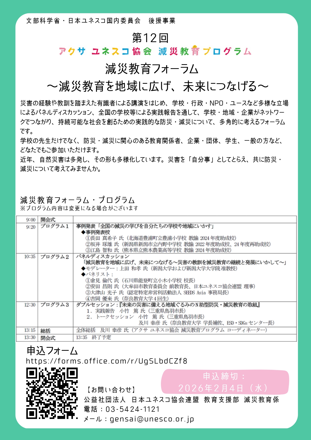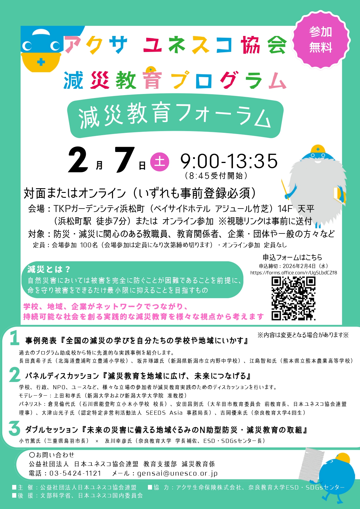防災・減災教育は、学校、地域や社会全体で考えていくことが重要です。多くの皆さまのご参加をお待ちしています!