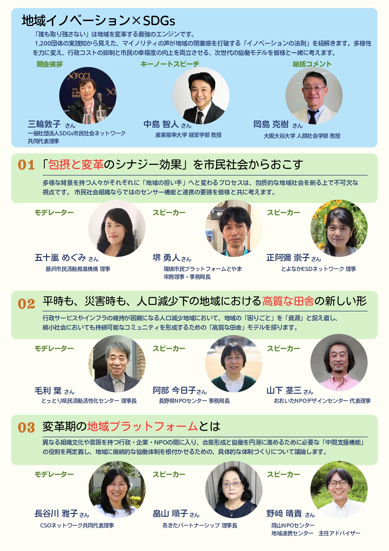 3年間のプロジェクトで得られた、多様な地域における実践知をそれぞれの地域の様々な関係者の方々と共有します。達成年が近づくSDGsとの向き合い方や持続可能な地域の在り方などを共に考える時間にしたいと思います。
