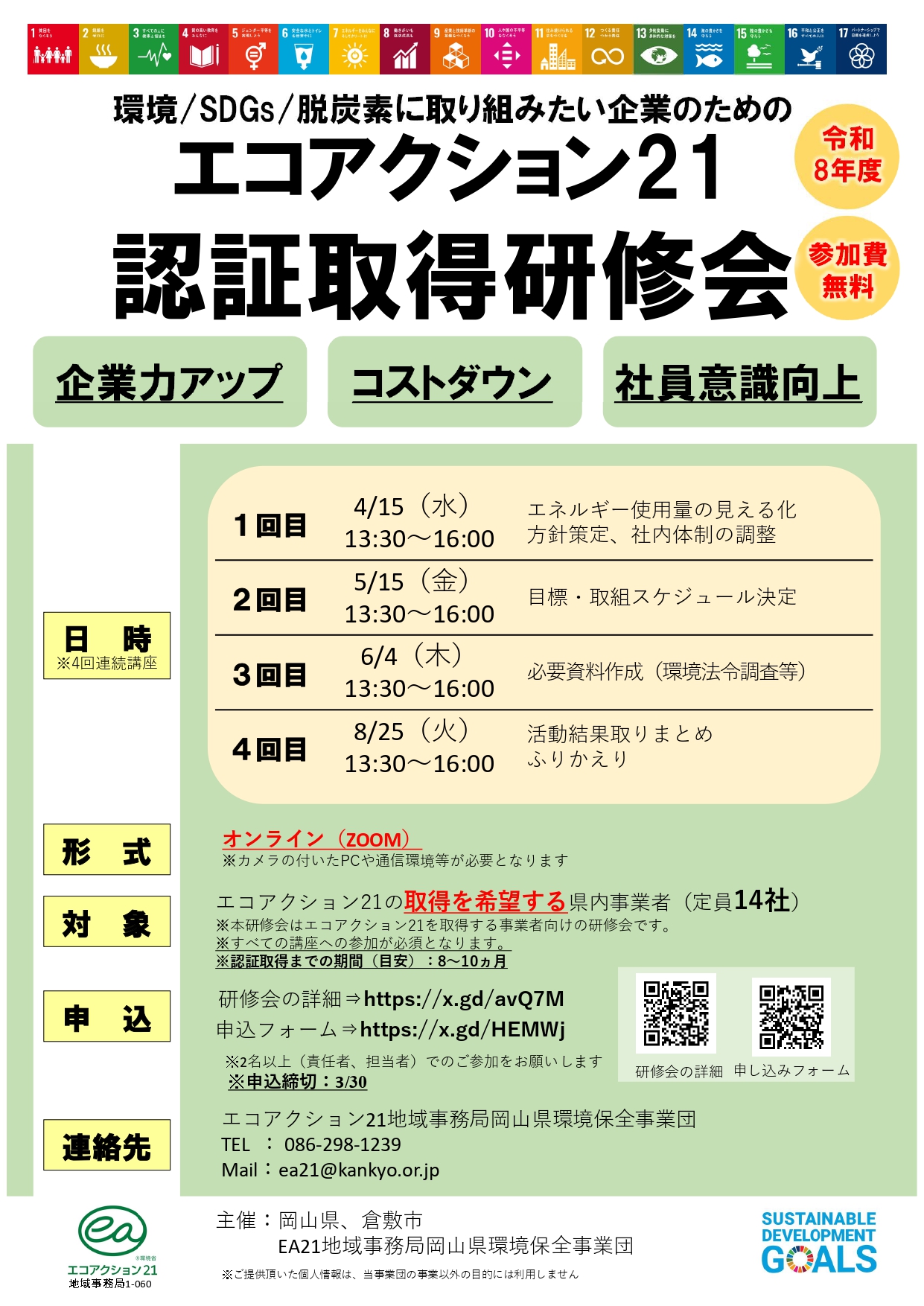 本研修会は、そのようなエコアクション21を取得されたい企業様のための研修会であり、審査員が取り組みに対するアドバイスを行い、取得を目指します。環境と経営の両立を目指される企業、環境課題や社会課題の解決に貢献したい企業様に特におすすめの研修会となっていますので、この機会にエコアクション21に取り組み、地域から選ばれる企業を一緒に目指しましょう!