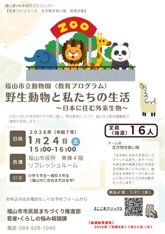 日本に住む外来生物やその取扱い、野生動物について福山市立動物園職員が講演を実施します!福山夢・未来開花プロジェクトチーム「生き物を救い隊」と一緒に、私たちの周りにいる生き物について学びませんか?