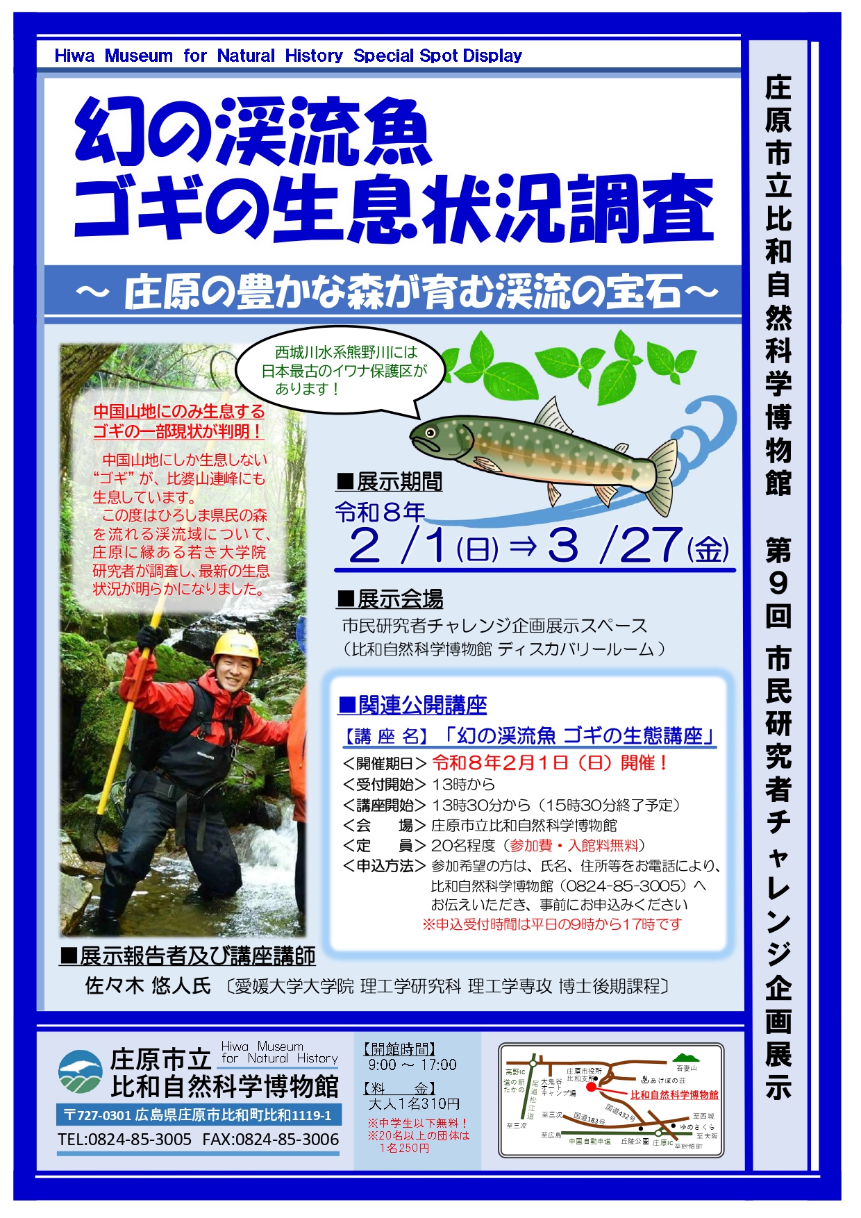 今回はその保護区近隣のひろしま県民の森を流れる渓流域について、愛媛大学大学院生_佐々木悠人氏が生息状況調査を実施しました。その成果を比和自然科学博物館でスポット展示にて発表します。
