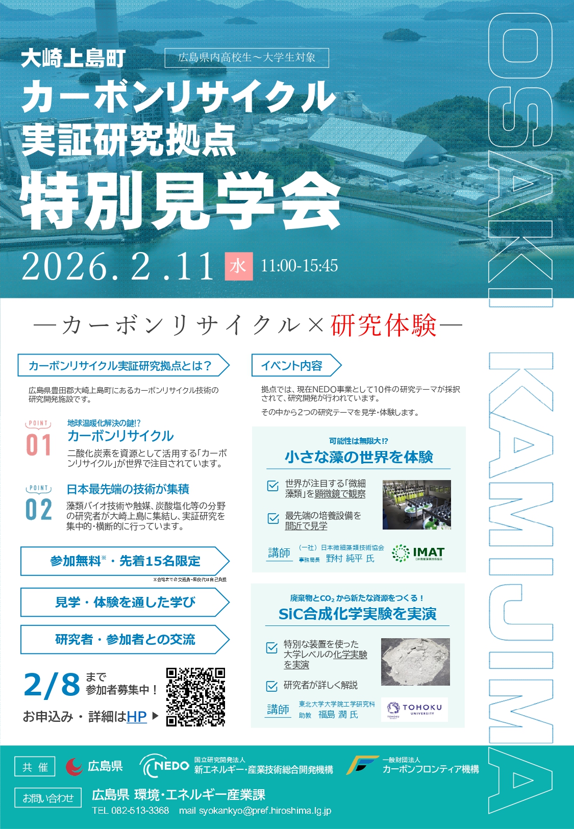 このイベントでは、2050年カーボンニュートラルに向けて、未来社会への貢献が期待される技術である「カーボンリサイクル」について、大崎上島町にある国内最先端の研究施設を、研究者による解説を交えながら見学することができます。また、実験の実演や研究体験も実施するので、学校では学ぶことのできないような生物・化学の生きた知識を、体感しながら得ることができます。