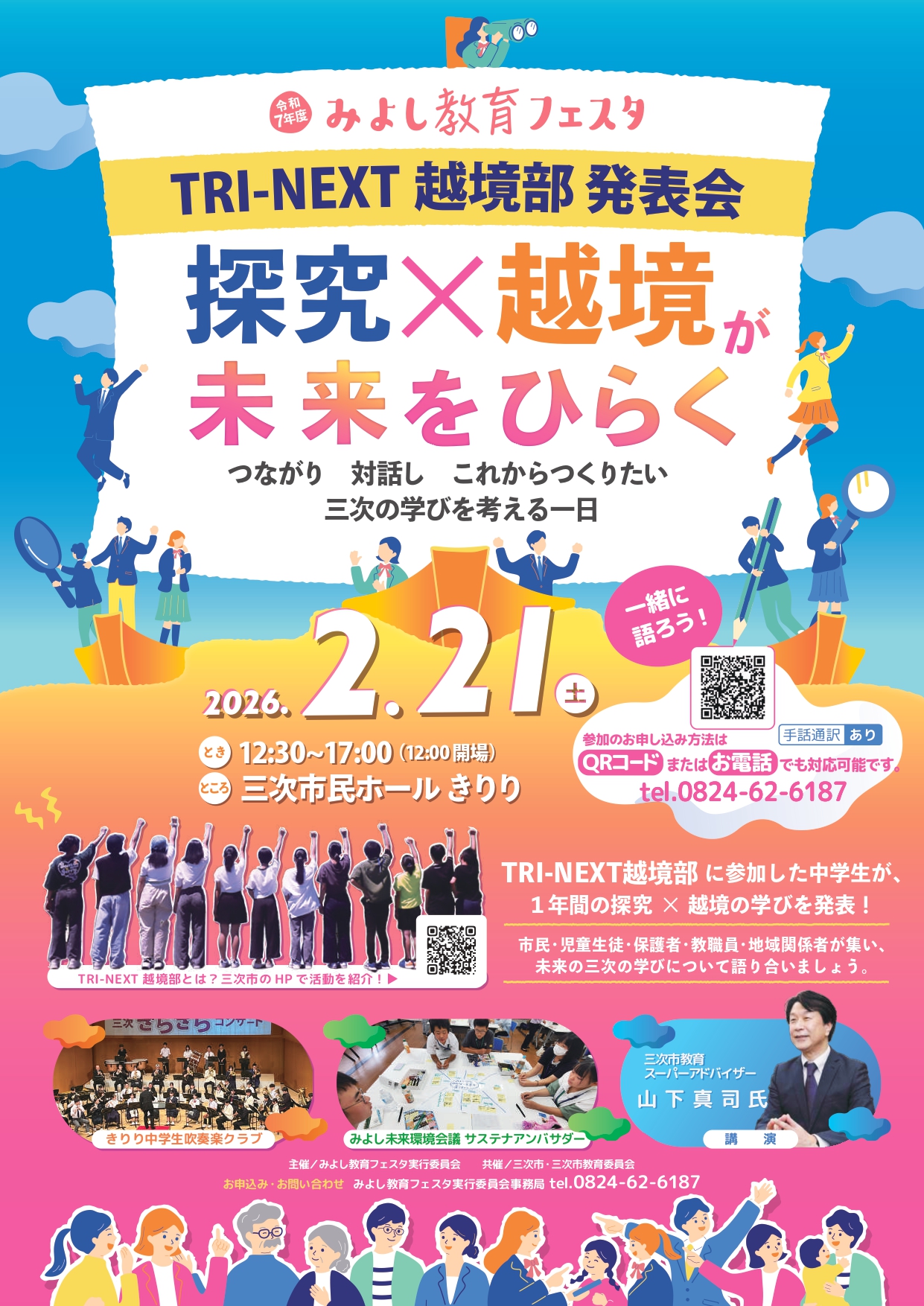 チラシの二次元コードから、または、みよし教育フェスタ実行委員会事務局(0824-62-6187)までお電話でお申し込みください。