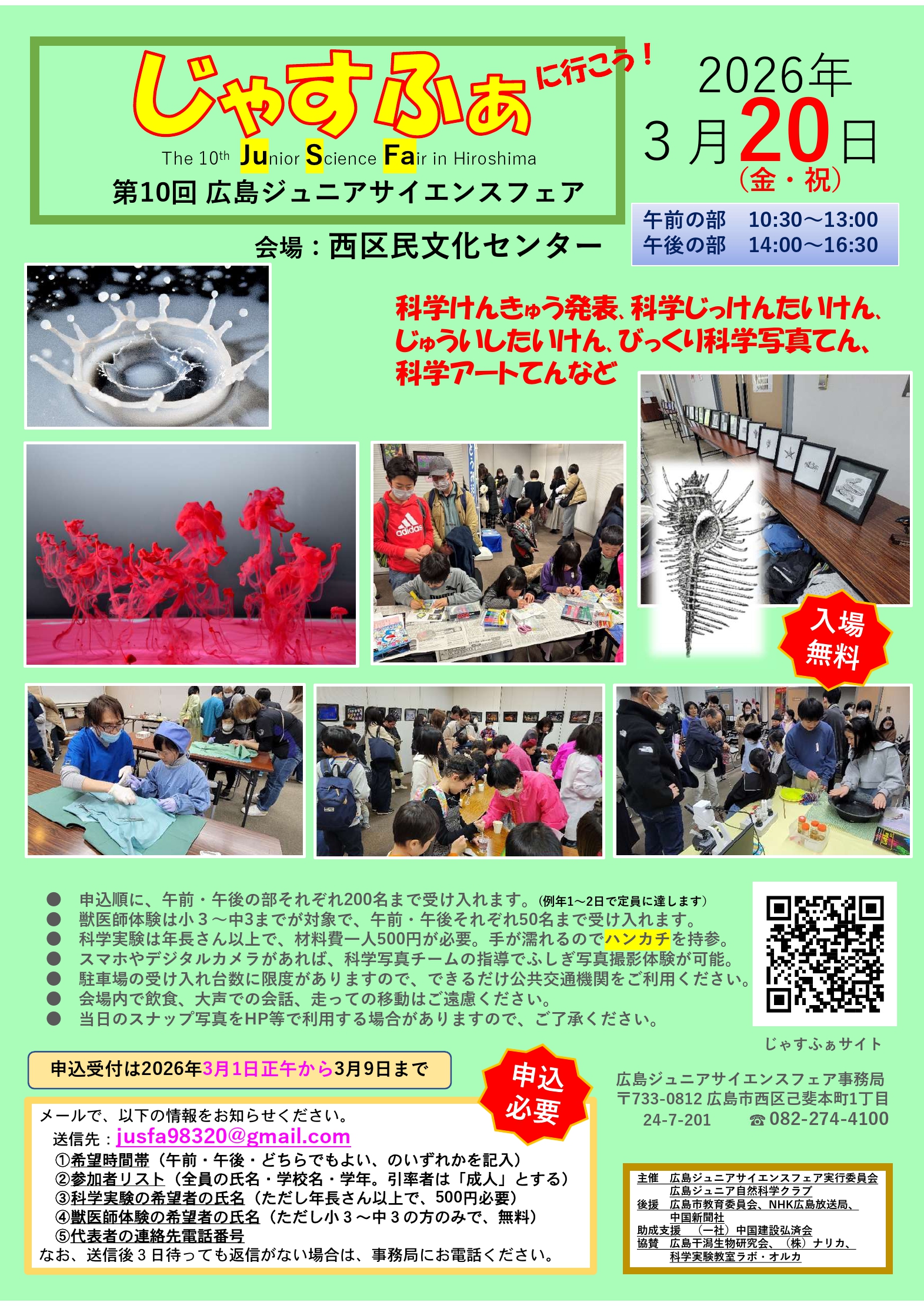 ※実験を体験したい年長さんから中学生のお子様には、資料と材料費として500円を受付でいただきます。大人と幼児は無料です。釣銭不要のご準備をお願いします。