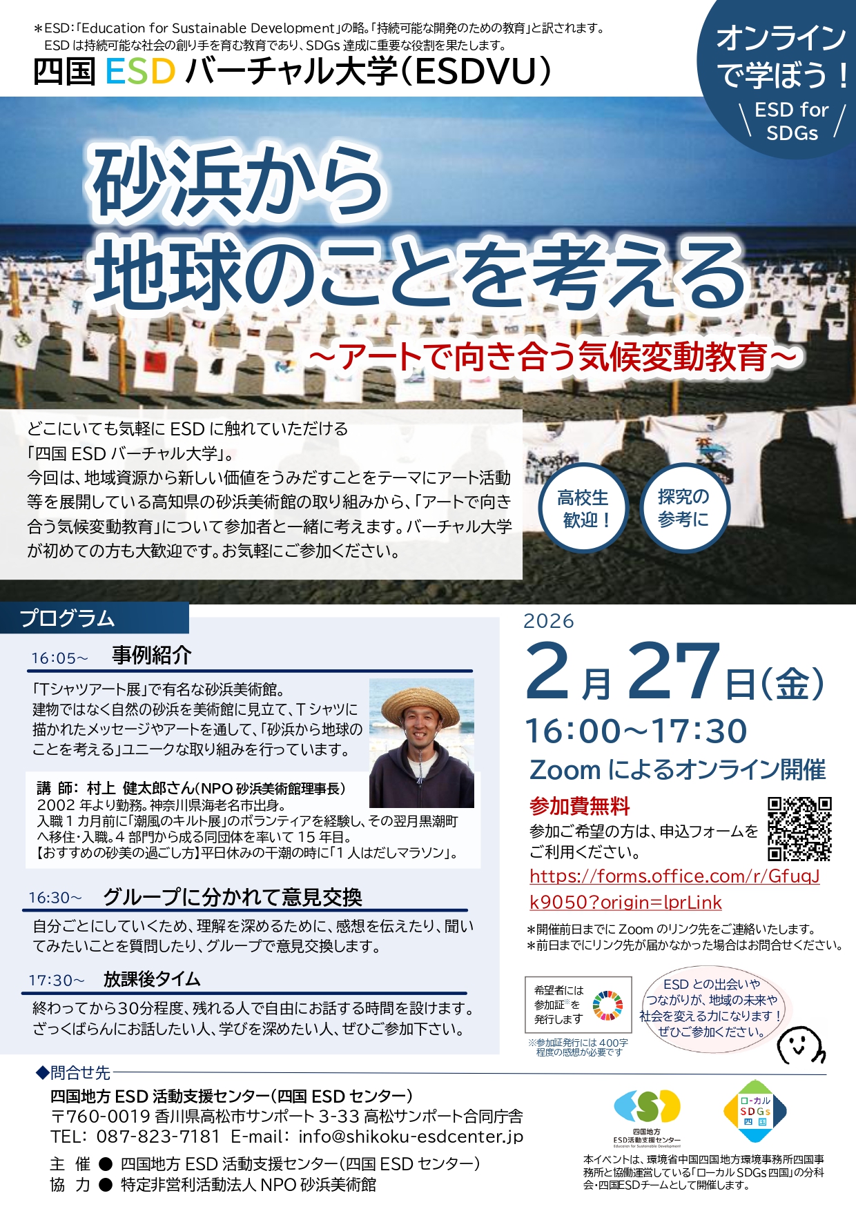 今回は、地域資源から新しい価値をうみだすことをテーマにアート活動等を展開している高知県の砂浜美術館の取り組みから、「アートで向き合う気候変動教育」について参加者と一緒に考えます。
