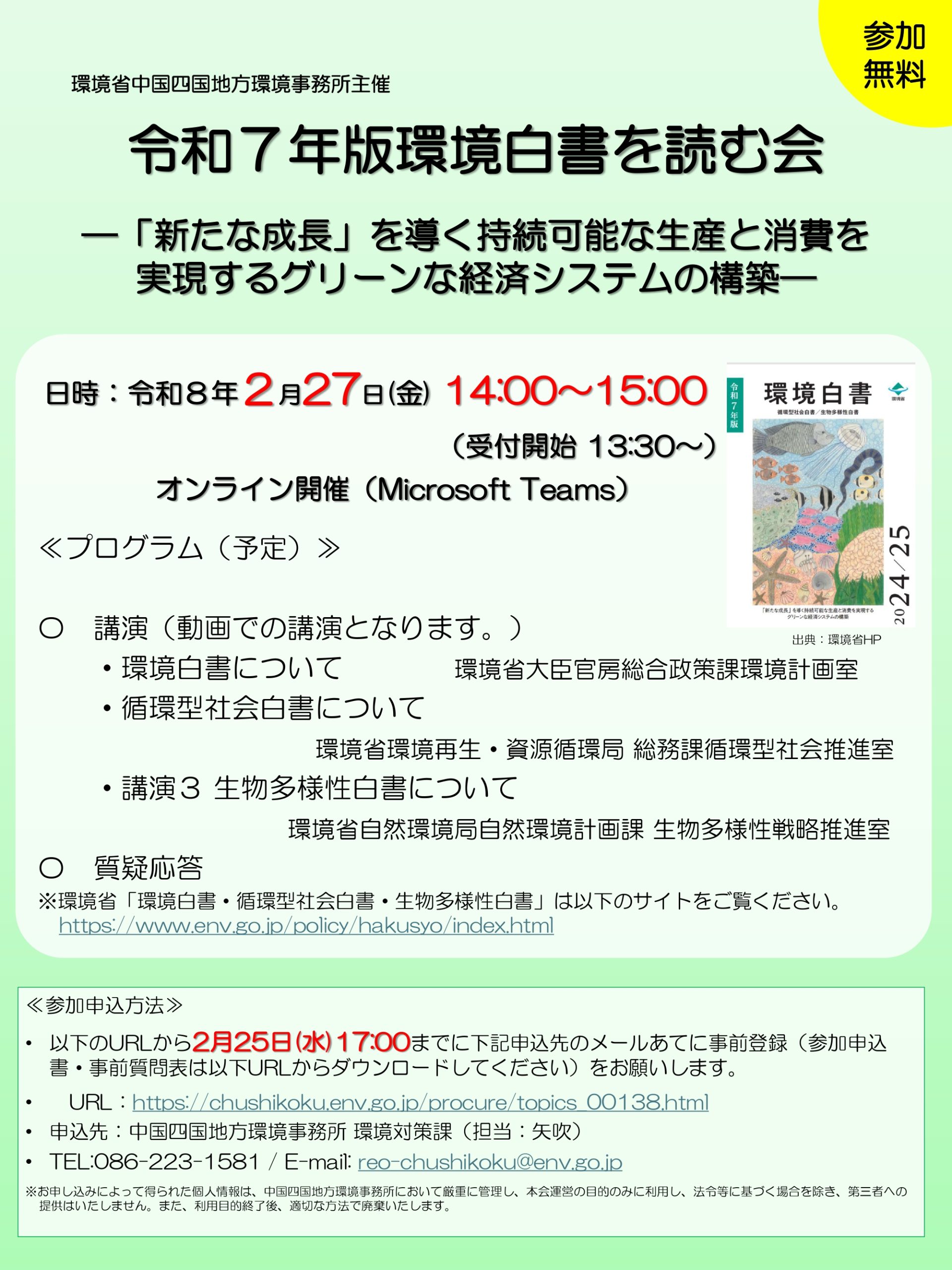 今年の環境白書のテーマである「新たな成長」を導く経済活動について、持続可能な生産と消費を実現するグリーンな経済システムを構築し、環境価値への適切な評価や、自然資本及び自然資本を維持・回復・充実させる資本システムへの長期的な視野に基づく投資を促していく取り組みについて、世界、我が国の環境問題や気象災害、それがもたらす経済的影響等も踏まえながら解説します。