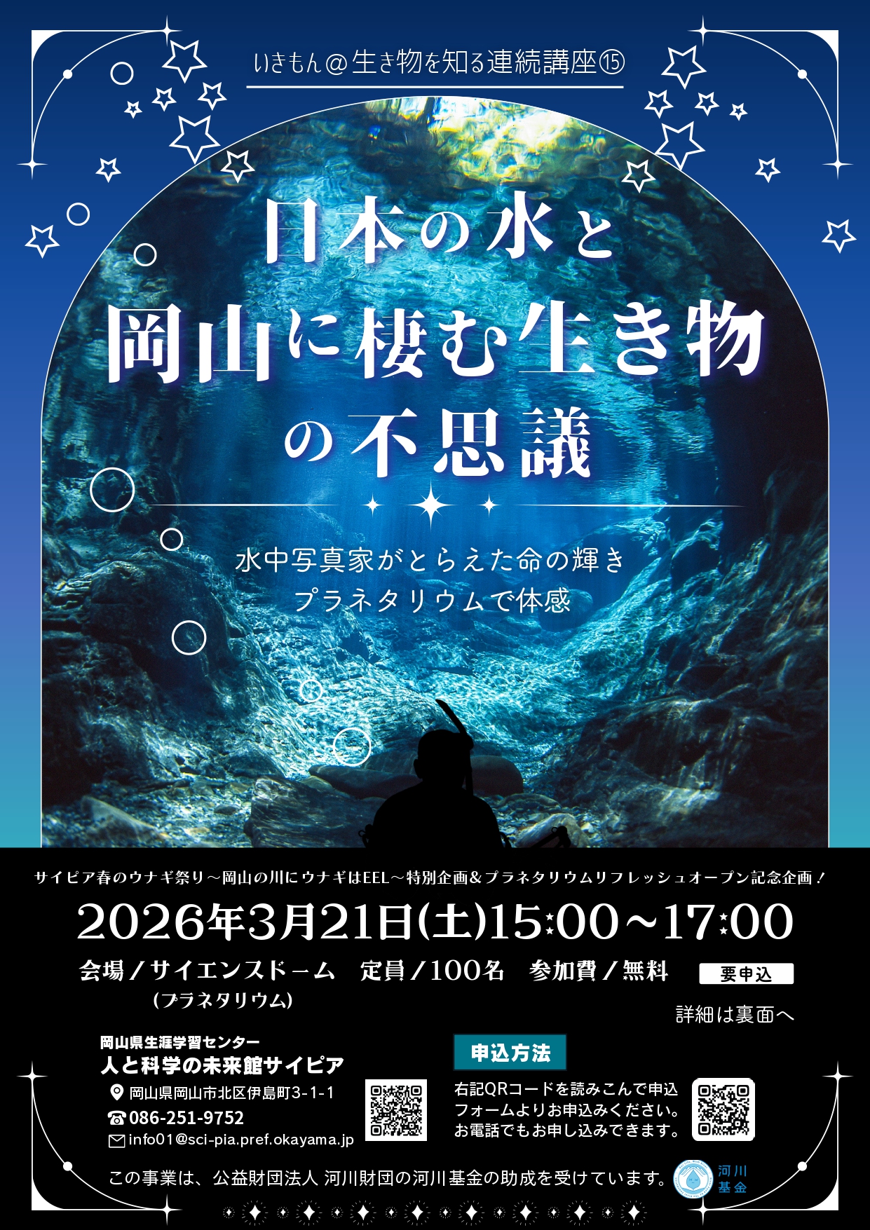 ネイチャーフォトグラファーの内山りゅう氏がとらえた、美しくもダイナミックな水中世界をプラネタリウムに投影。アユモドキやタナゴ類など、岡山を象徴する希少な生き物たちとそれらを育む水についてお話いただきます。後半には岡山でウナギの研究を続けている海部健三先生や脇谷量子郎先生を交えたクロストークや、アクアマリンふくしまからの生中継も予定しています。