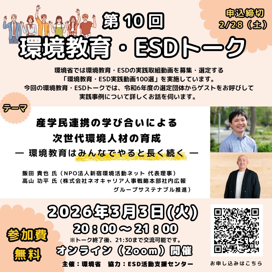 今回の環境教育・ESDトークでは、令和7年度の選定団体からゲストをお呼びして、環境教育・ESDの実践事例について詳しくお話を伺います。