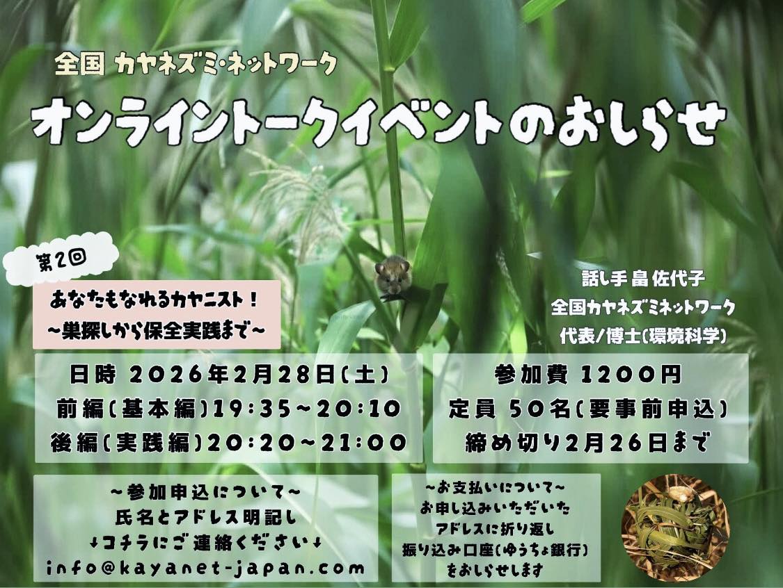 *オンライン・トークイベントは、カヤネズミやカヤ原への関心と本会の活動への理解を広げるとともに、今年10月に開催予定のカヤネズミとカヤ原保全のシンポジウム「第3回カヤ・サミット」の開催費用に充てる目的で実施しています。