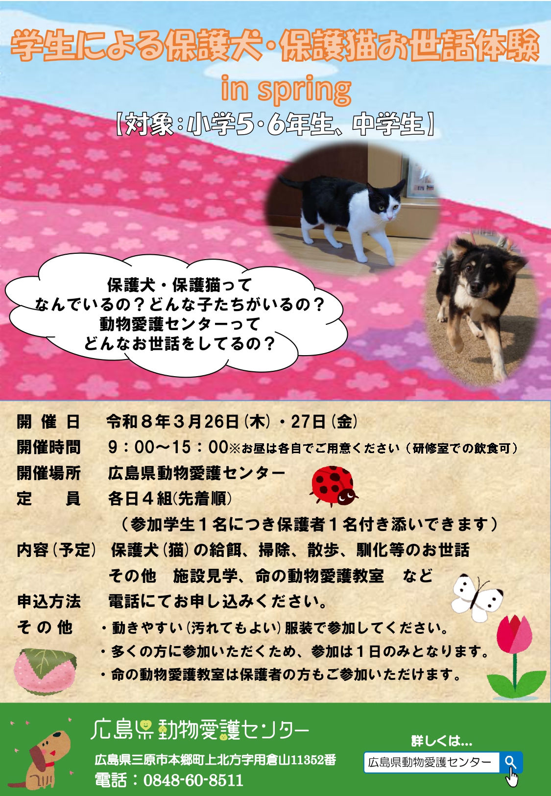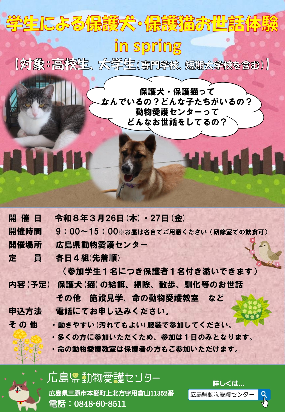 今回は、春休みに2日開催します。興味のある学生の方は、いずれか希望する1日を申し込み、私達と一緒に保護犬や保護猫のお世話をしませんか?
