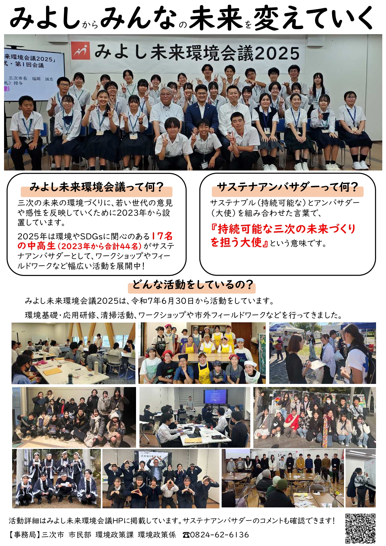 「みよし未来環境会議」とは、三次の未来の環境づくりに、若い世代の意見や感性を反映していくために設置しました。