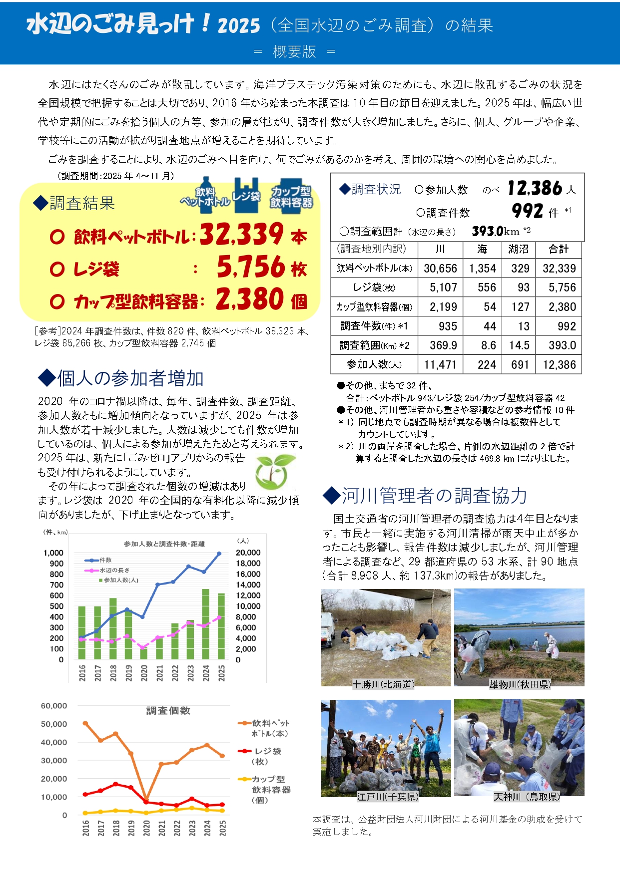 2016年から始まった「水辺のごみ見っけ!」(全国水辺のごみ調査)は10年目の節目を迎えました。2025年は、幅広い世代や定期的にごみを拾う個人の方等、参加の層が拡がり、調査件数が大きく増加しました。